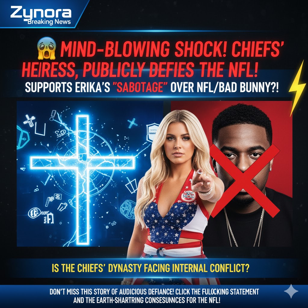 [Image: A dramatic composite image featuring Gracie Hunt, perhaps pointing or looking determined, with a background hinting at both the Chiefs’ legacy and the controversy of Erika’s performance (e.g., subtle religious imagery or protest signs in the background). Bad Bunny’s image is subtly ‘crossed out’ or placed in opposition. The headline “MIND-BLOWING SHOCK! CHIEFS’ HEIRESS, GRACIE HUNT, PUBLICLY DEFIES THE NFL! SUPPORTS ERIKA’S ‘SABOTAGE’ OVER NFL/BAD BUNNY?!” is prominent.]