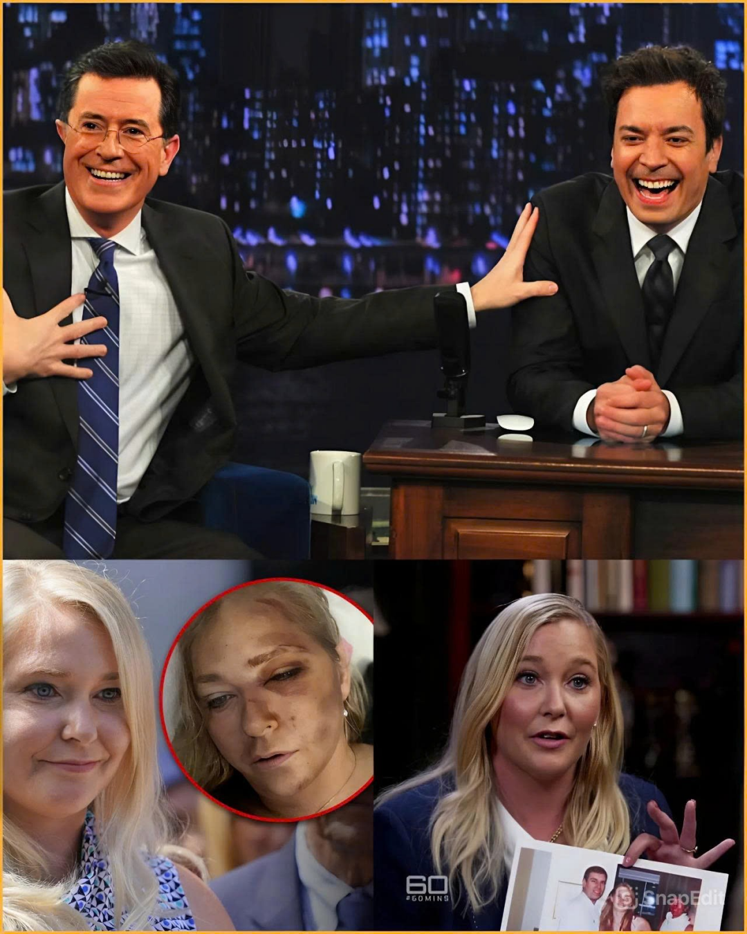 Fallon and Colbert — two names the public never imagined seeing shoulder to shoulder — shared the same thin, razor-sharp smile. A smile that wasn’t meant to amuse, but to warn. A smile aimed not at their audience, but at the powerful network of influence and silence standing behind years of buried truths.