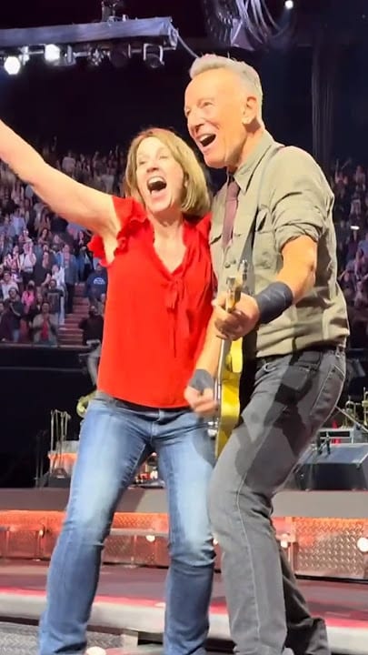 Bruce leaned close, said something that made her laugh through tears, then spun her gently toward center stage. The arena erupted again as they hit the chorus together, the place shaking with applause.