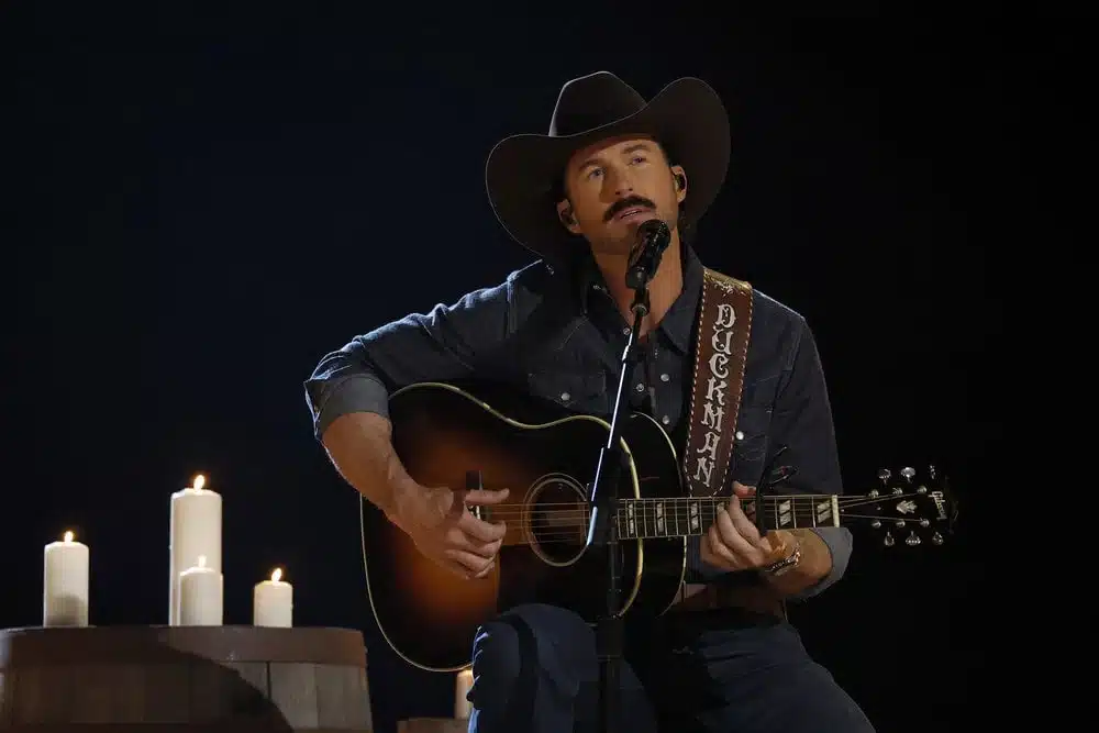 Green opened the performance alone, seated on a stool in the middle of a stage designed to resemble a giant whiskey barrel. Surrounded by flickering candles and illuminated by a single spotlight, the Alabama native strummed his guitar while singing the reflective opening verse of the breakup ballad. His warm vocals set the tone for the tender, whiskey-soaked confession.