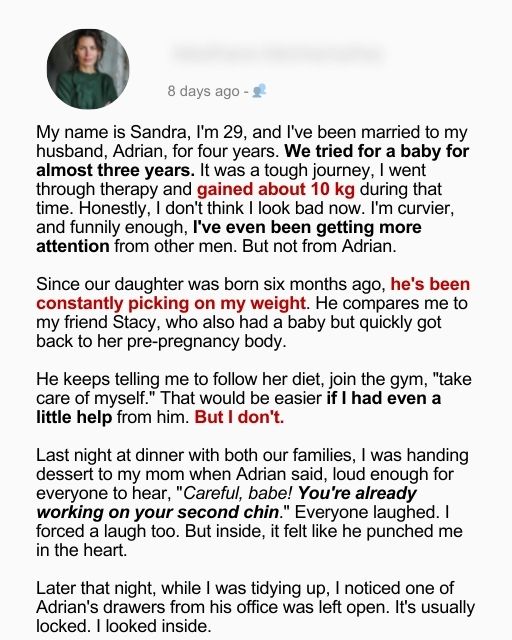 My name is Sandra. I’m 29, four years into a marriage I once believed would be my safest place. We tried for a baby for almost three of those years, through hormone swings, quiet prayers, and therapy appointments that left me wrung out but determined. I gained about ten kilos along the way. My body changed, yes—but I still recognized myself in the mirror. Some days I even liked the new softness. Strangers noticed me more than they used to. Everyone, it seemed, except my husband.