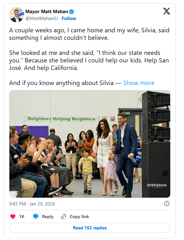 Mahan made the announcement in a lenghthy post on X, saying he’s running for governor “because we can do better,” and that he’s proved that in San Jose.