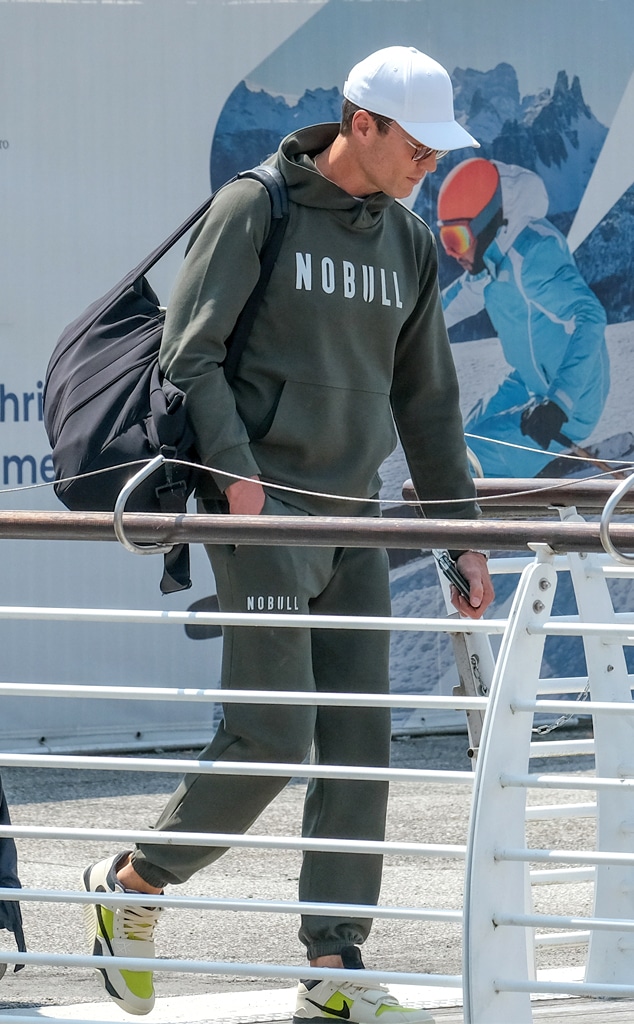 Tom Brady sported a Nobull sweatsuit as he transferred from plane to boat at the Venice Marco Polo airport in Venice.