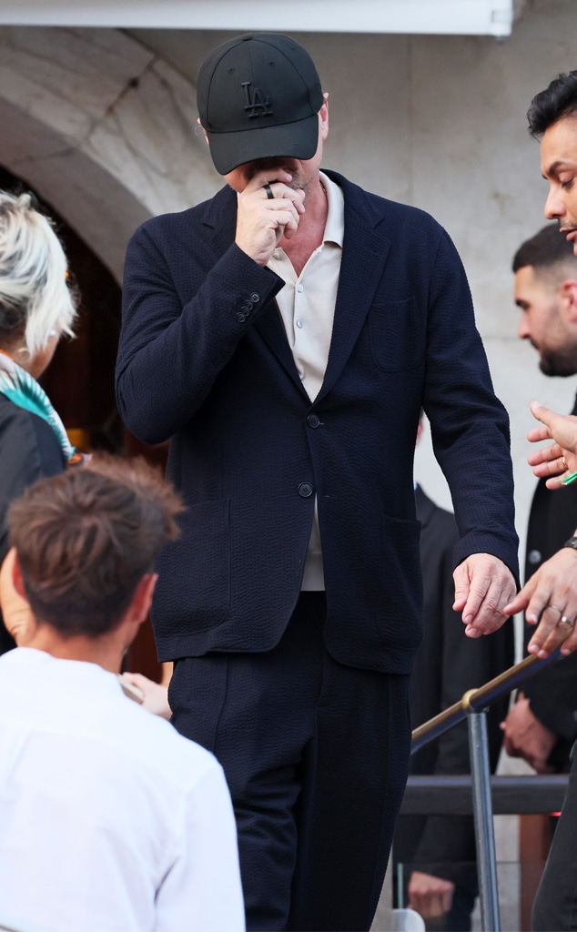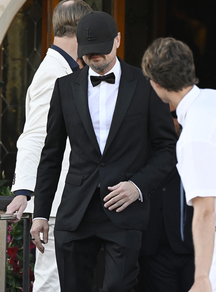 Leonardo tried to go incognito the day before the wedding in a dark suit and black L.A. Dodgers baseball cap as he joined the other guests for an evening out.