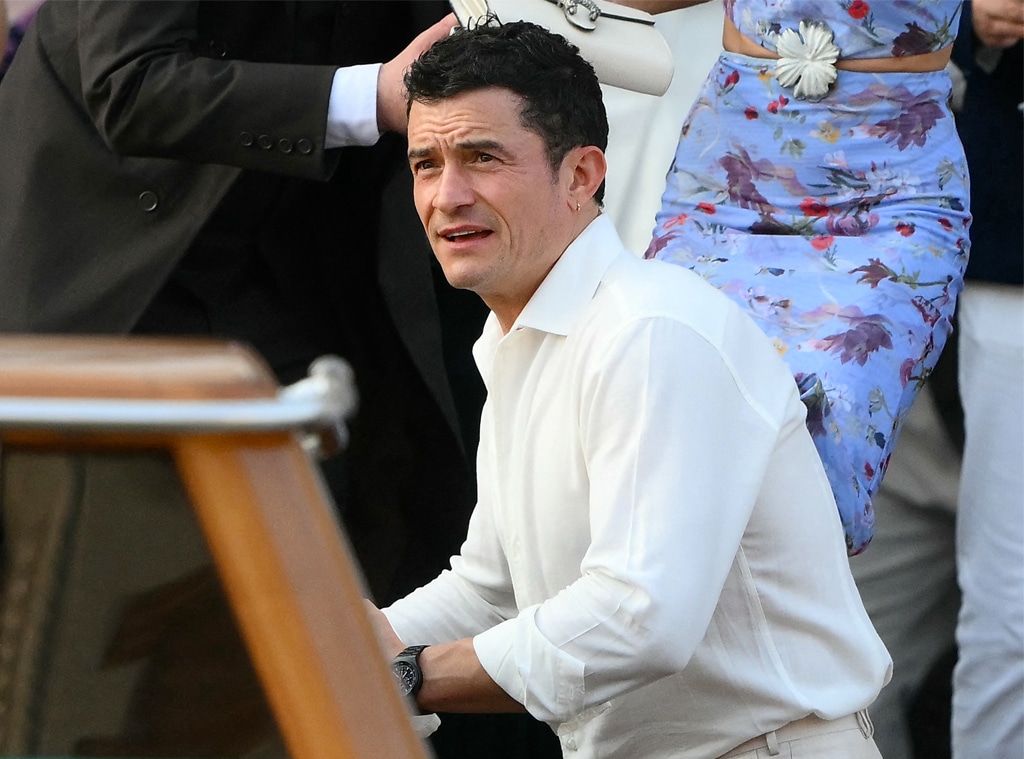 Orlando hopped into a boat along with other wedding guests for an evening out in Venice.